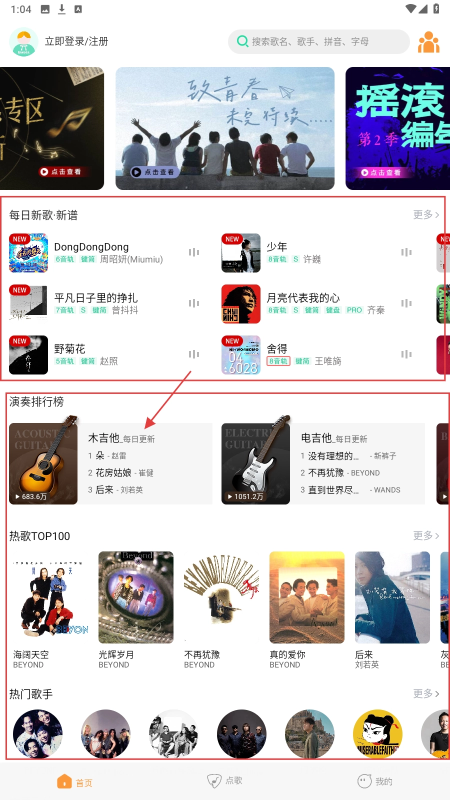 1、打开应用后,首页有【每日新歌新谱】【演奏排行榜】等板块,可根据喜好选择进入。