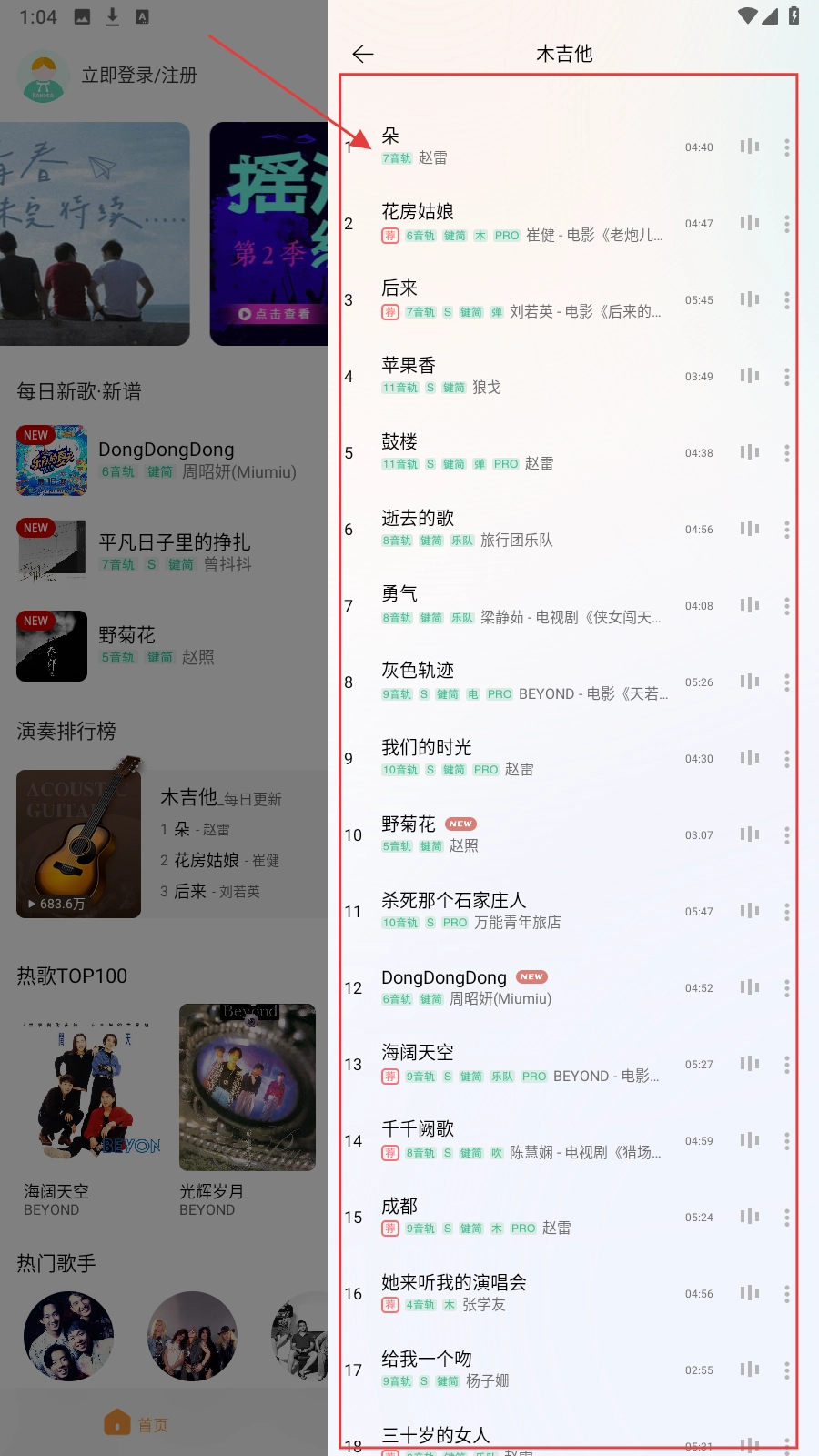 2、若对【木吉他】演奏榜感兴趣,点击进入后,可查看包含【朵】等歌曲的列表,点击可播放。