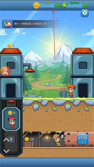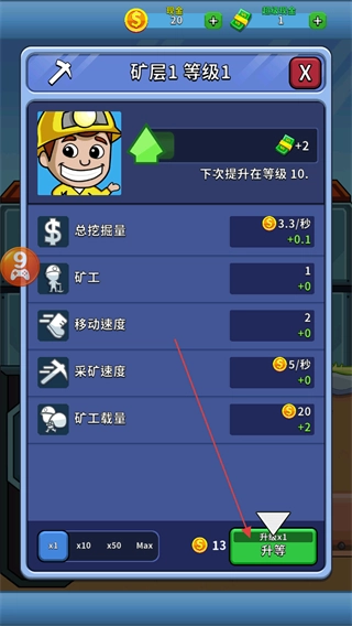 4、矿层等级升至2级,矿工持续挖掘,资源自动结算,推进游戏进程。