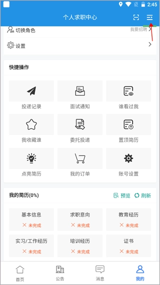 1. 个人求职中心:求职动态自主掌控**简历填写、头像上传以及职场图片和证书的添加操作都非常便捷。