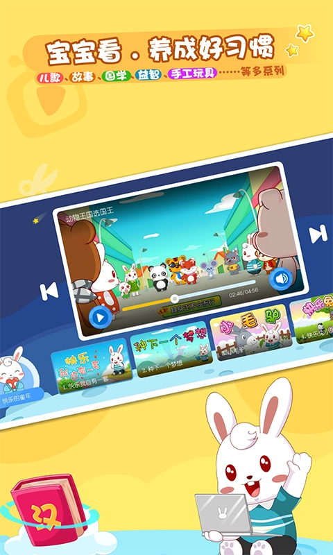兔小贝乐园是一款面向0-6岁儿童的早教启蒙应用,丰富的早教动画视频与益智互动游戏,海量免费动画支持高清观看,孩子可通过儿歌、故事、国学等趣味内容,进行多样化的早教启蒙,轻松掌握启蒙知识。平台还具备学习时间管控功能,能帮助家长合理安排孩子的休息时间,同时支持动画视频定制播放,助力宝宝健康学习、快乐成长。