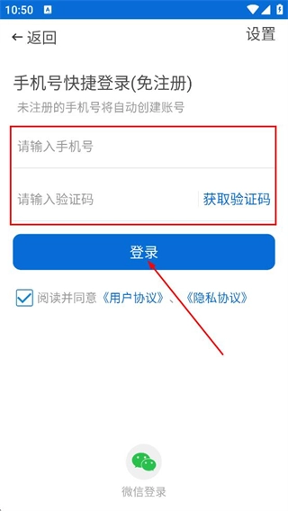 3、进入快捷登录页面后,依次填写手机号、获取并输入验证码,随后点击登录按钮,即可完成账号登录操作。