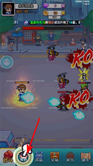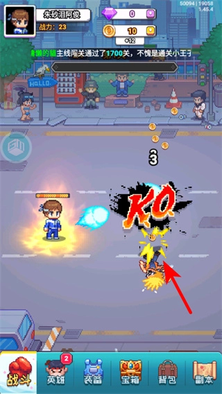 2、战斗中持续点击屏幕保持输出节奏,击败单个敌人后会获得积分奖励,同时触KO提示,推进关卡的进度条。