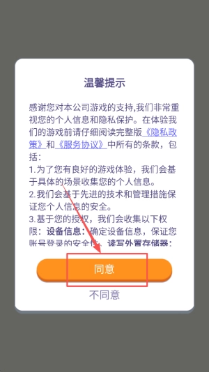 1、首先,请阅读并同意个人信息保护指引,随后点击“同意”按钮,即可进入游戏。