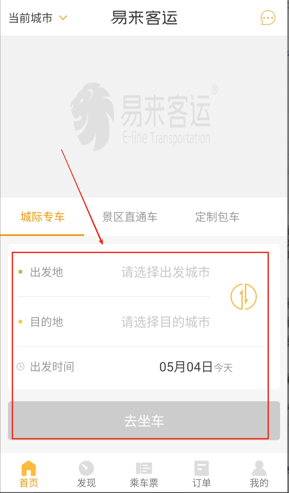 2、在首页填写起点、终点及出行时间,筛选出可用的车辆。