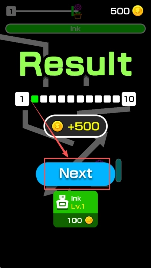 4、完成关卡:在显示Result+500的界面点击Next按钮,继续进行挑战。