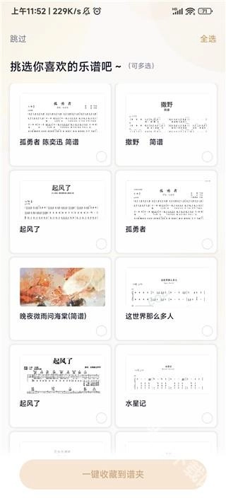3、选好乐器后,挑选你喜爱的乐谱,点击右上角就能实现全选操作。