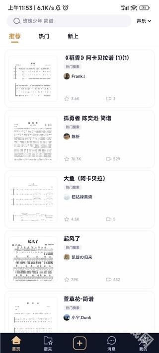 4、进入首页,可以看到这里有推荐,热门和新上的乐谱;
