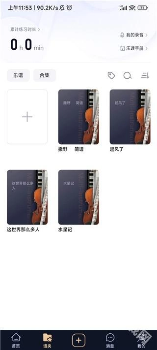 5、点击谱夹,在这里你可以查看自己的练习时长以及收藏的乐谱。