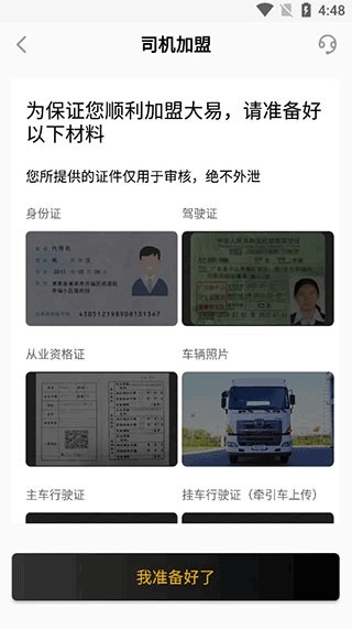 2、司机加盟,为了保证您顺利加盟大易,请准备好以下材料,点击我准备好了;
