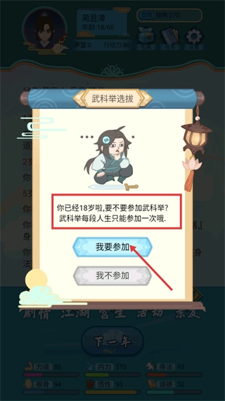 1、角色年满18岁时将触发【武科举选拔】活动,此活动在每段人生中仅可参与一次,点击【我要参加】按钮即可开启武科举挑战。