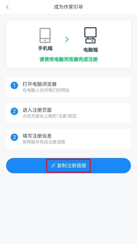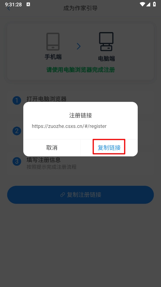 4、按照图示操作,弹出对应的弹框后,点击其中的“注册链接”,随后在电脑浏览器里填写相关信息完成注册就可以了。