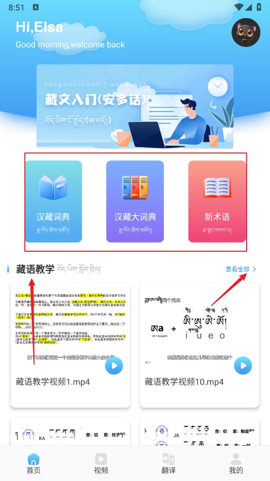 5、最后在翻译板块,有多个藏语短语可供一键开启学习。