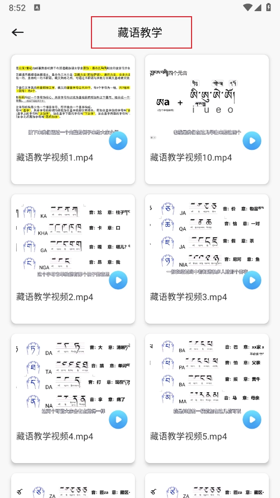 3、点击“藏语教学”右侧的“查看全部”按钮进入,页面中会呈现多个教学视频,可点击打开进行学习。