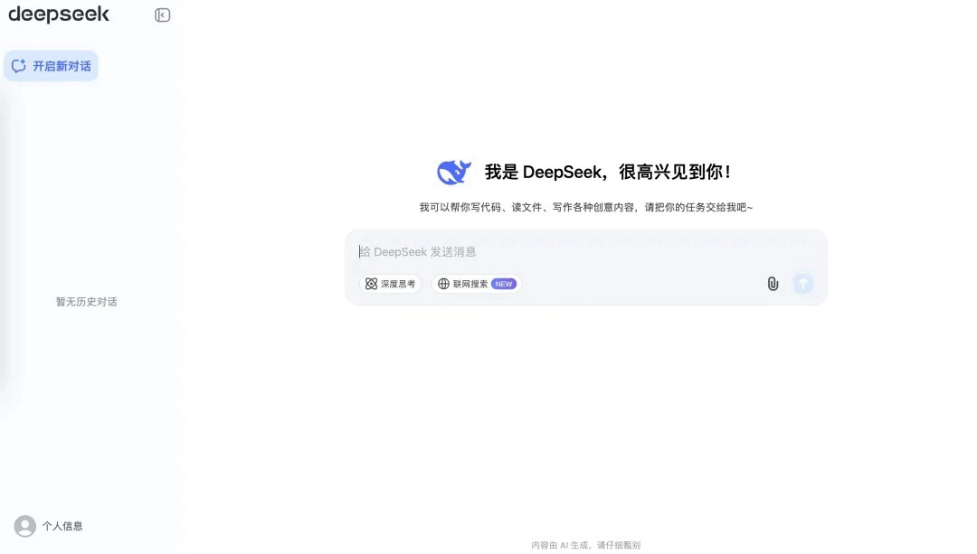 注册登录后就可以进入到DeepSeek的chat页面了,可以看到DeepSeek的chat与主流模型的chat功能很像,提供了普通会话、深度思考、联网搜索以及文件模式。