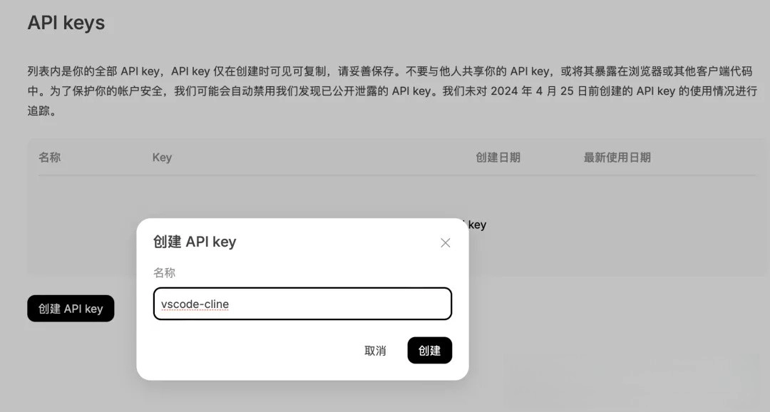 注意:已创建的API Key只能修改名称,无法再次查看Key,创建完成后需要妥善保管 API key。