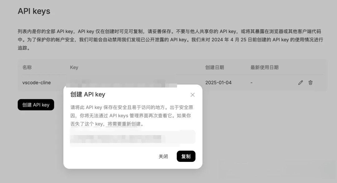 创建完成后将API Key保存起来,参考API接入文档即可在其他模型平台使用。