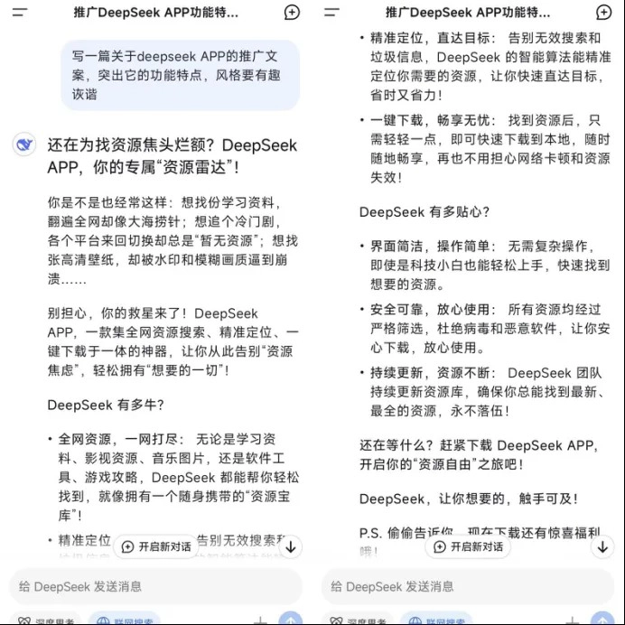 接下来,小编输入Prompt“写一篇关于DeepSeek 的推广文案,突出它的功能特点,风格要有趣诙谐”。