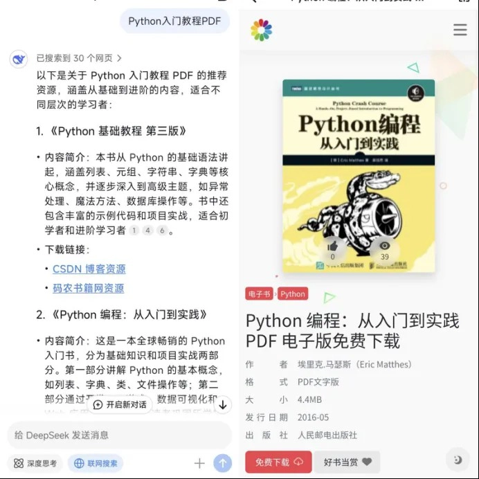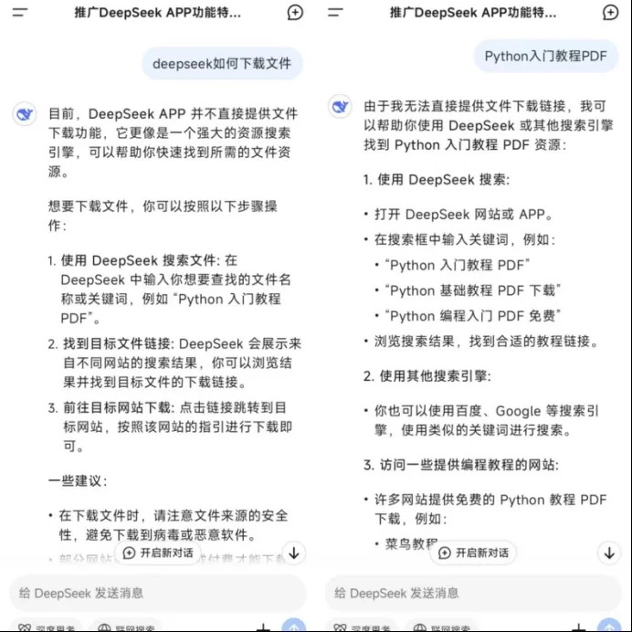此时得到的回复是无法直接提供链接,于是小编开启“联网搜索”功能后,再次提问“DeepSeek如何文件”。