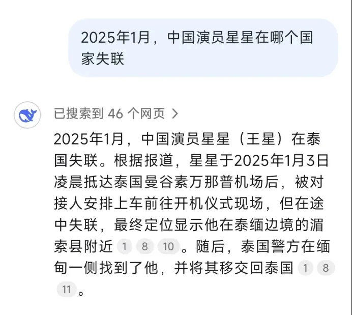 既然已经打开了联网搜索功能,小编根据近一周内的社会热点对DeepSeek进行提问“2026年1月,中国演员星星在哪个国家失联?”