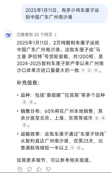 小编注意到,2万吨智利车厘子运抵中国的新闻被冲上热搜,于是打算考一下DeepSeek“2026年1月11日,有多少吨智利车厘子运到中国广东广州南沙港”。