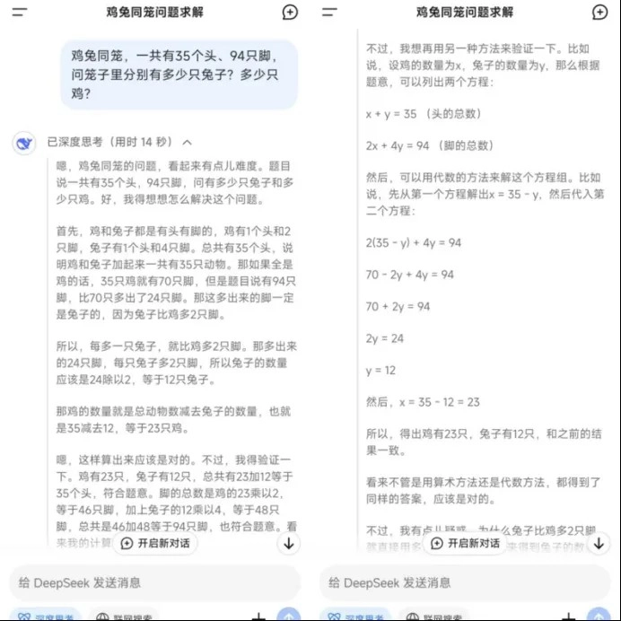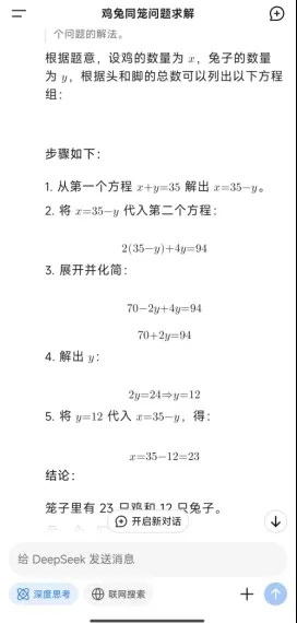 既然联网搜索功能能让DeepSeek变得聪明,那接下来就试一下其深度思考能力吧。小编输入了数学里最火的鸡兔同笼问题“鸡兔同笼,一共有35个头、94只脚,问笼子里分别有多少只兔子?多少只鸡?”