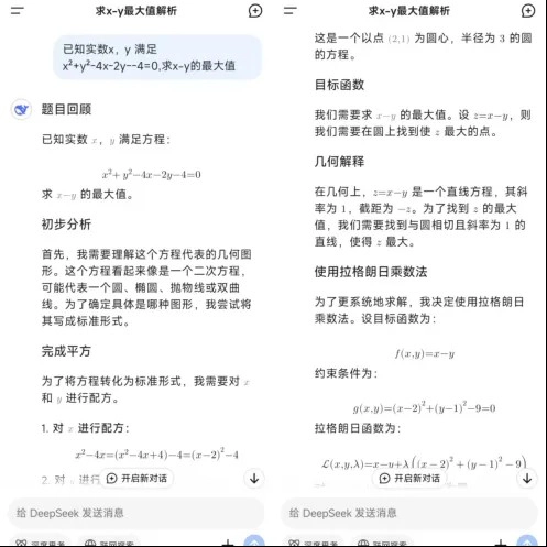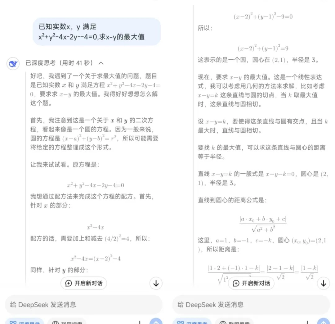 小编关闭深度思考之后,重新对DeepSeek进行提问“已知实数x,y 满足x²+y²-4x-2y--4=0,求x-y的最大值”。