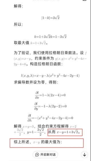 但是,DeepSeek似乎是代入到了成功解答的喜悦中,在最后的“综上所述中,x-y的最大值 ”居然没写完!