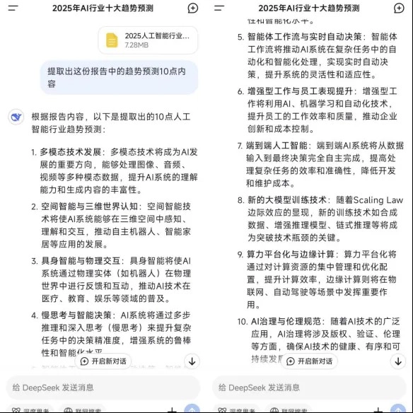 DeepSeek快速进行了内容识别,并根据提示词“提取出这份报告中的趋势预测10点内容”,给出了《2026人工智能行业趋势报告》中的十大预测并分点罗列正确。