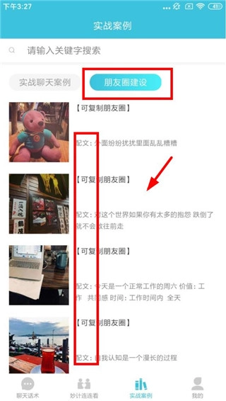 5、另外,要是你不清楚如何发布朋友圈,也可以点击朋友圈建设功能,自主挑选文案进行复制发布。
