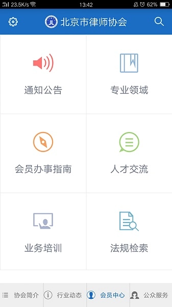 主要提供与会员相关的信息和服务,包括:会员信息、通知公告、专业领域、会员办事指南、人才交流、业务培训、法规检索、