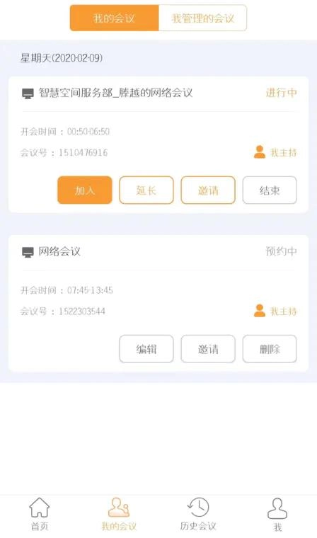 会议信息,【我的会议】显示发起人或邀约的会议列表(即未开始/进行中的会议列表)