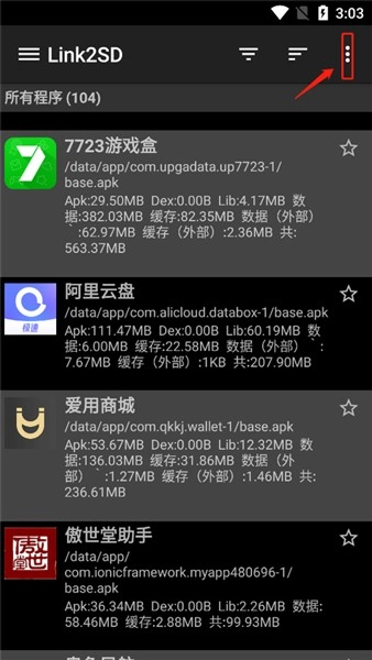 1、打开Link2SD中文版后,点击页面右上角的三个点图标。