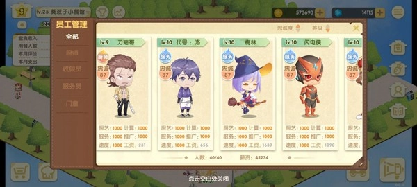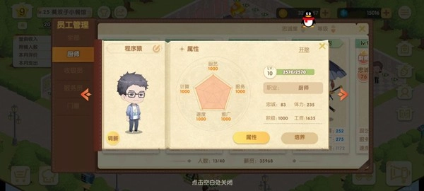 打开员工界面就能查看已招聘的员工。随着餐厅星级提高,客人数量会不断增加,即便手动协助点菜也会应接不暇,客人的满意度会从大笑脸慢慢降低。这种情况下就需要多招聘一些服务员,厨师、收银员与服务员的配比建议保持在1:1:2左右。