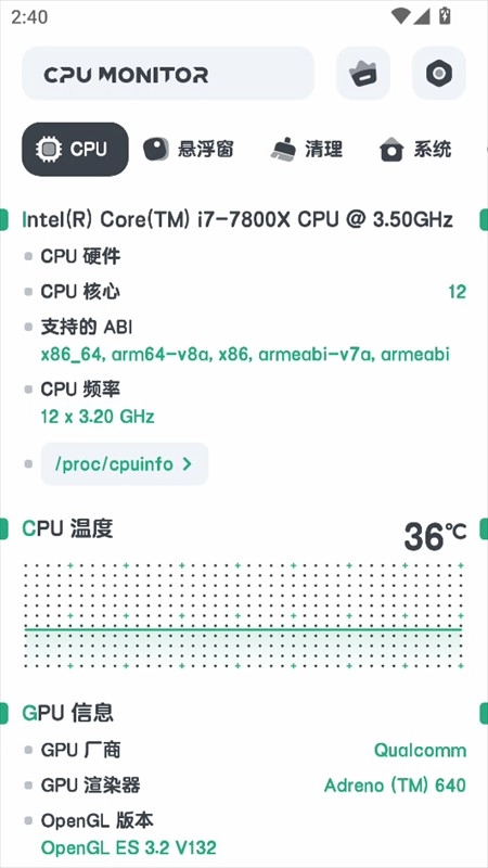1、实时监测CPU负载信息,精准呈现CPU温度、运行频率、使用率等各类详细数据,助你随时掌握设备的性能状态。