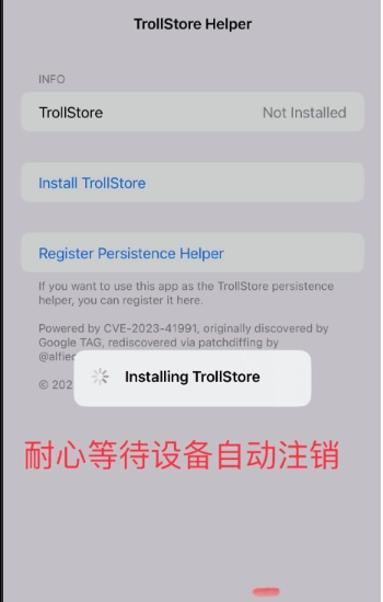 7. 打开提示后点击Install TrollStore选项,耐心等待设备自动注销(其他选项不要乱动)。
