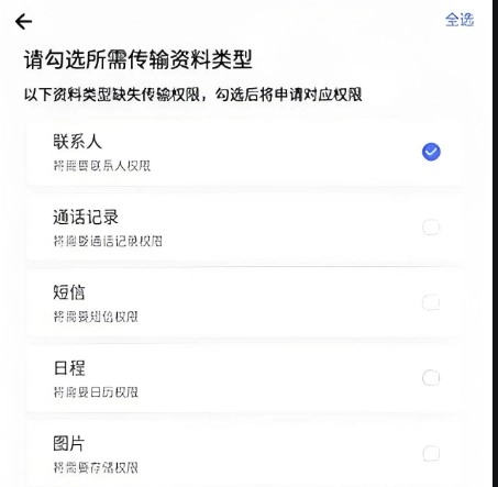 2、勾选所要传输资料的类型