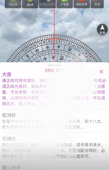 罗盘相机可以看等高线、底图、定位、水系、天心线、自动、户型图、相机实景等。可以边拍边看方位,也会根据坐标的移动同步更新方位信息。