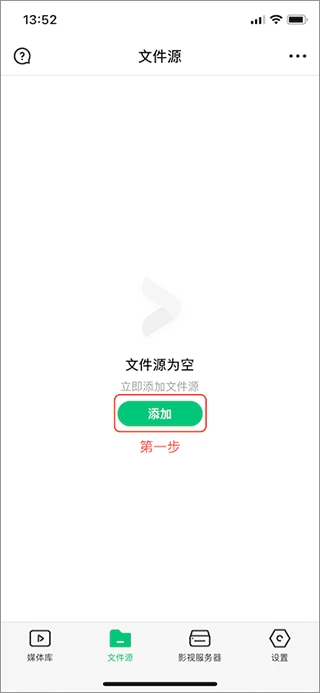 第一步:初次进入VidHub App后可以看到“媒体库”的添加按钮,点击“添加”按钮;