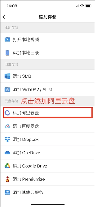 第二步:点击“添加”按钮后,再点击“添加存储”,会跳转到添加存储的页面,这里以阿里云盘为例进行示范。