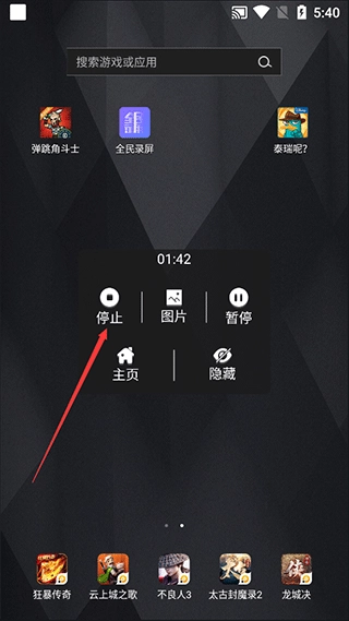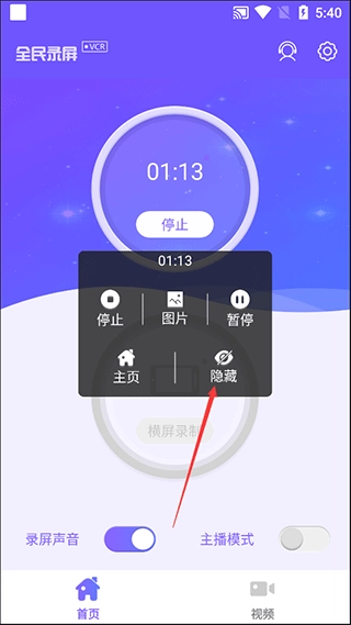 2、打开你想要录制的界面,点击悬浮窗显示:录制、截图、隐藏、主页、设置五个功能按键,选择录制将为你录制视频,正在录制时点击悬浮窗,选择停止将为您停止录屏,并自动保存界面跳至视频页面。