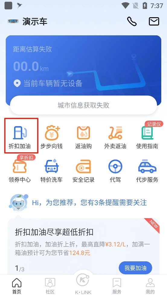 1、打开凯励程,点击折扣加油