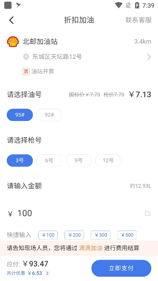 3、挑选油号与枪号后输入金额,若有折扣会显示出来,接着点击立即支付