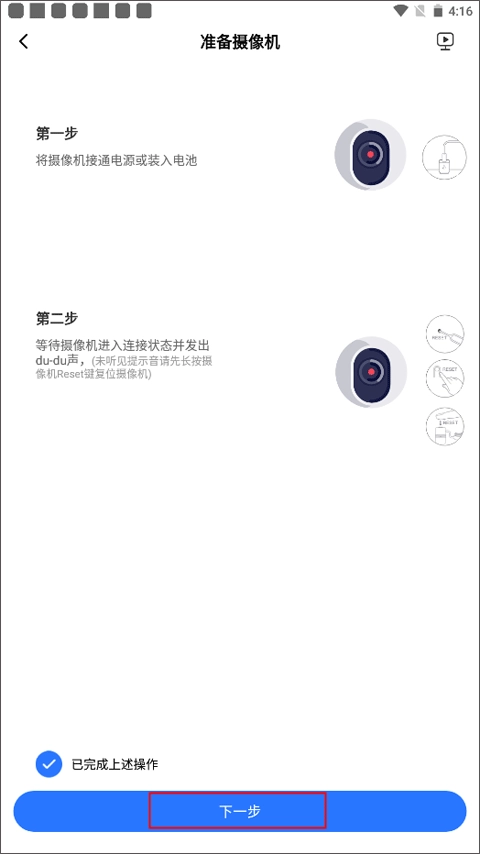 1、首先先将摄像机接通电源或装入电池,然后等待摄像机进入连接状态并发出du-du声(未听见提示音请先长按摄像机Reset键复位摄像机)。