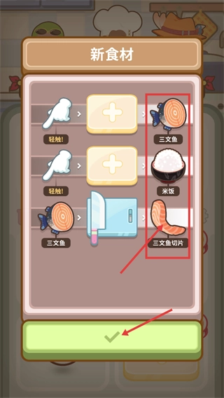 1、进入【新食材】界面后,轻触获取【三文鱼】与【米饭】,使用【刀具】将【三文鱼】加工成【三文鱼切片】,操作完成后点击界面下方的对勾按钮确认。