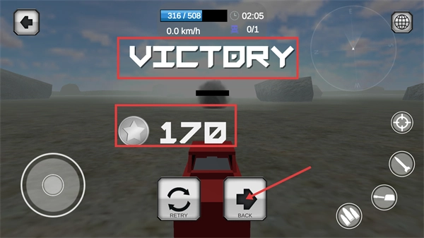 4、战斗胜利后会显示【VICTORY】,可获得【170】星星奖励,之后选【RETRY】重玩或点【BACK】返回界面。
