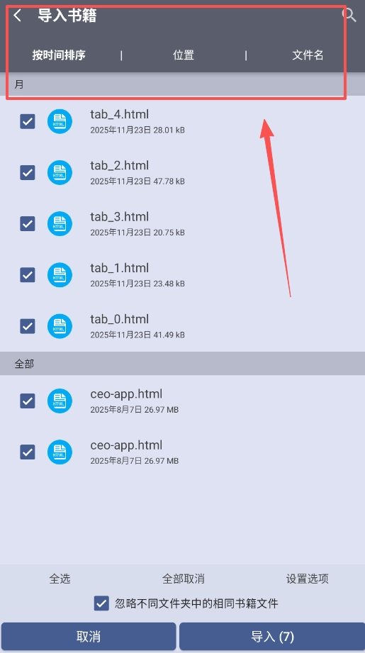2、在书籍导入页面,利用排序和全选功能快速筛选目标文件,导入前确认已开启忽略相同书籍的选项。