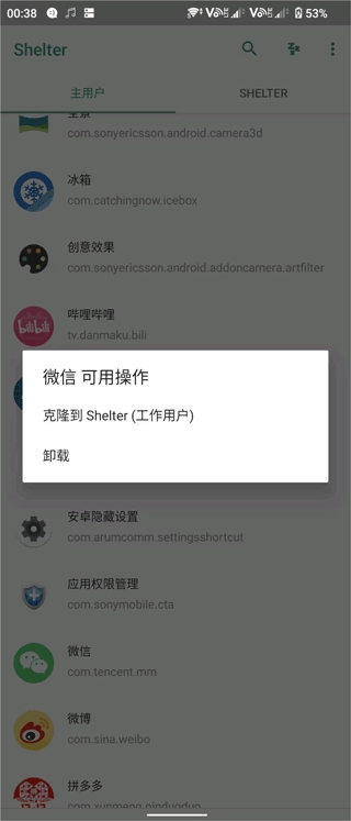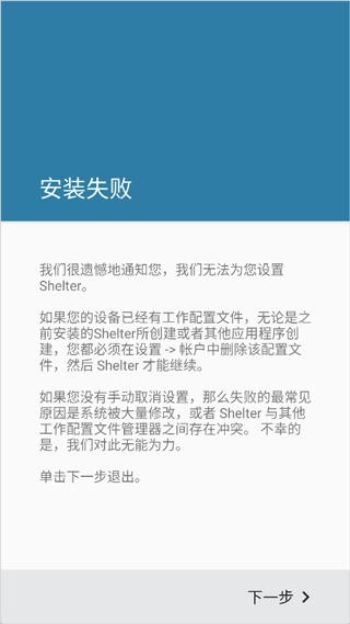 1、若用户手机上已存在工作配置文件,需先在手机设置的帐户选项中删除该工作配置文件,Shelter才能正常运行,否则会出现失败提示。