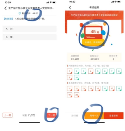 考试开始时要留意考试时间,答题完成后点击提交按钮需进行人脸识别,识别通过后就能查看考试分数以及正确和错误的答案。