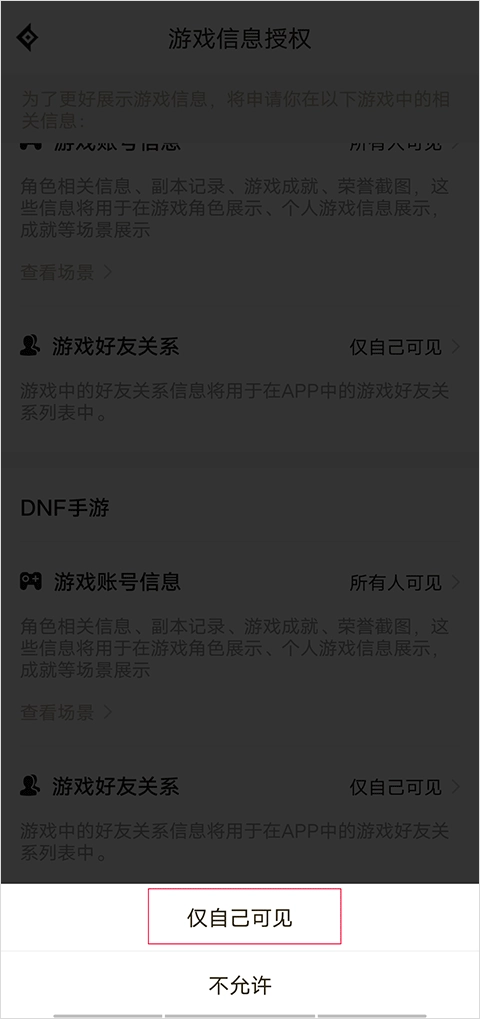 4、进入游戏信息授权界面后,点击游戏账号信息右侧的所有人可见选项。